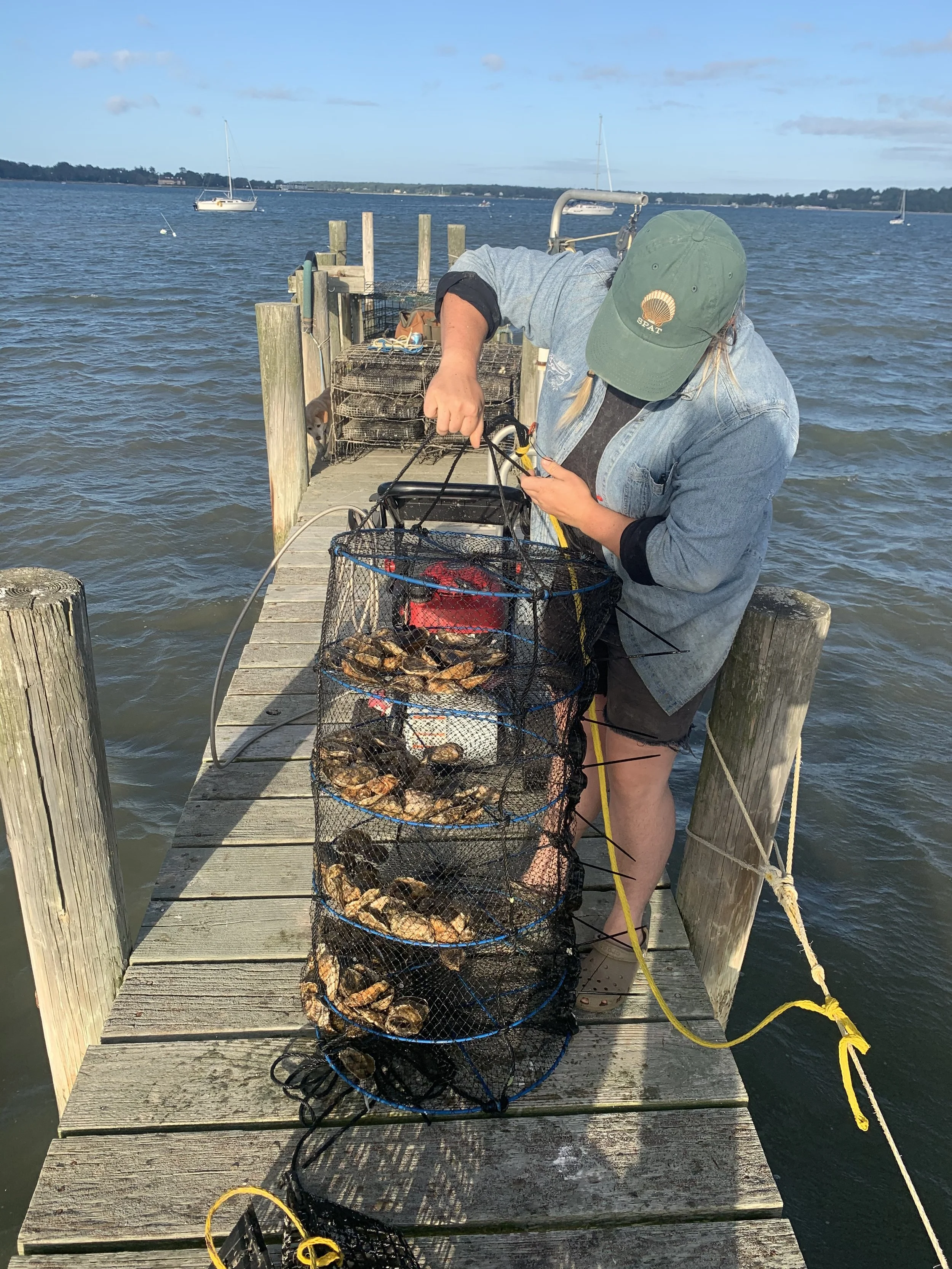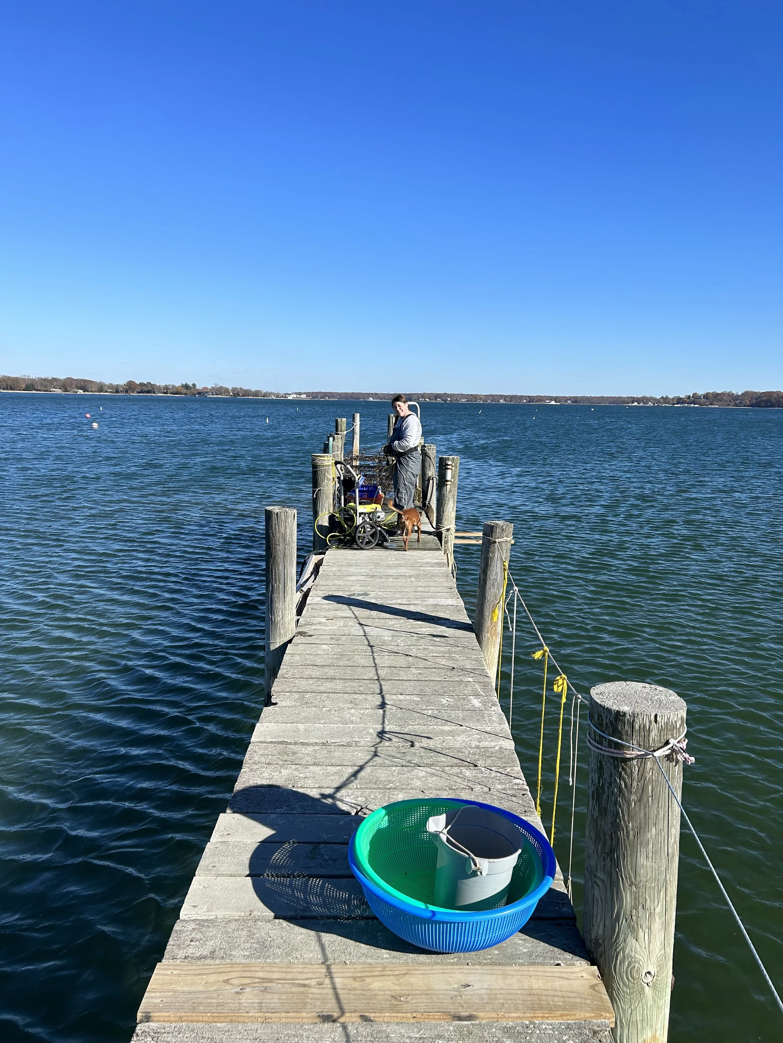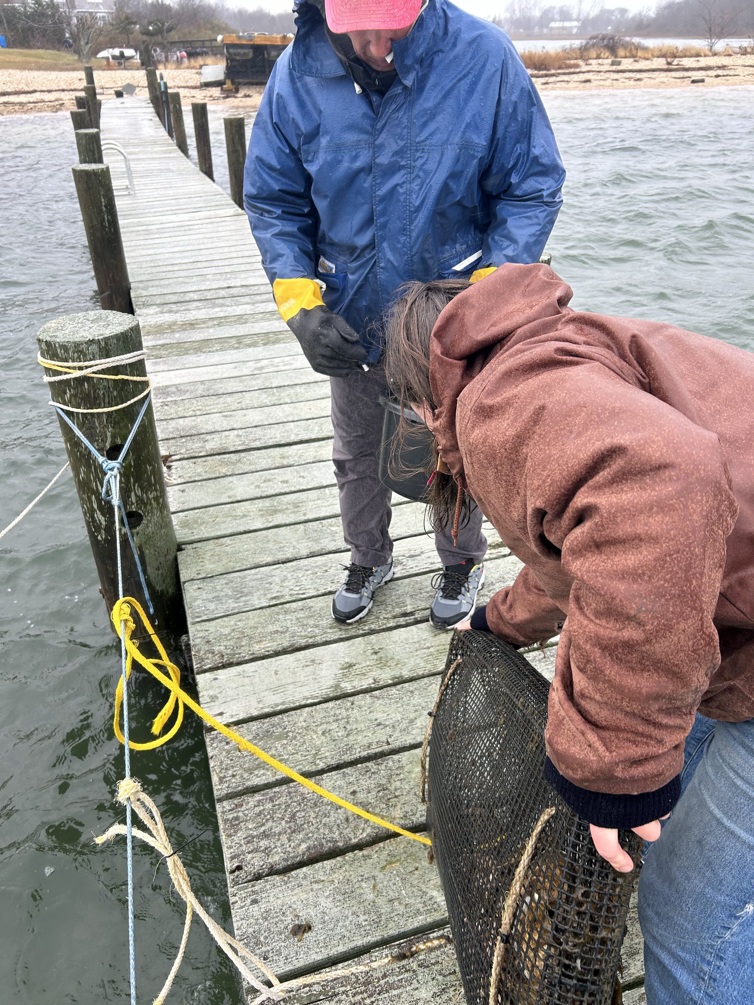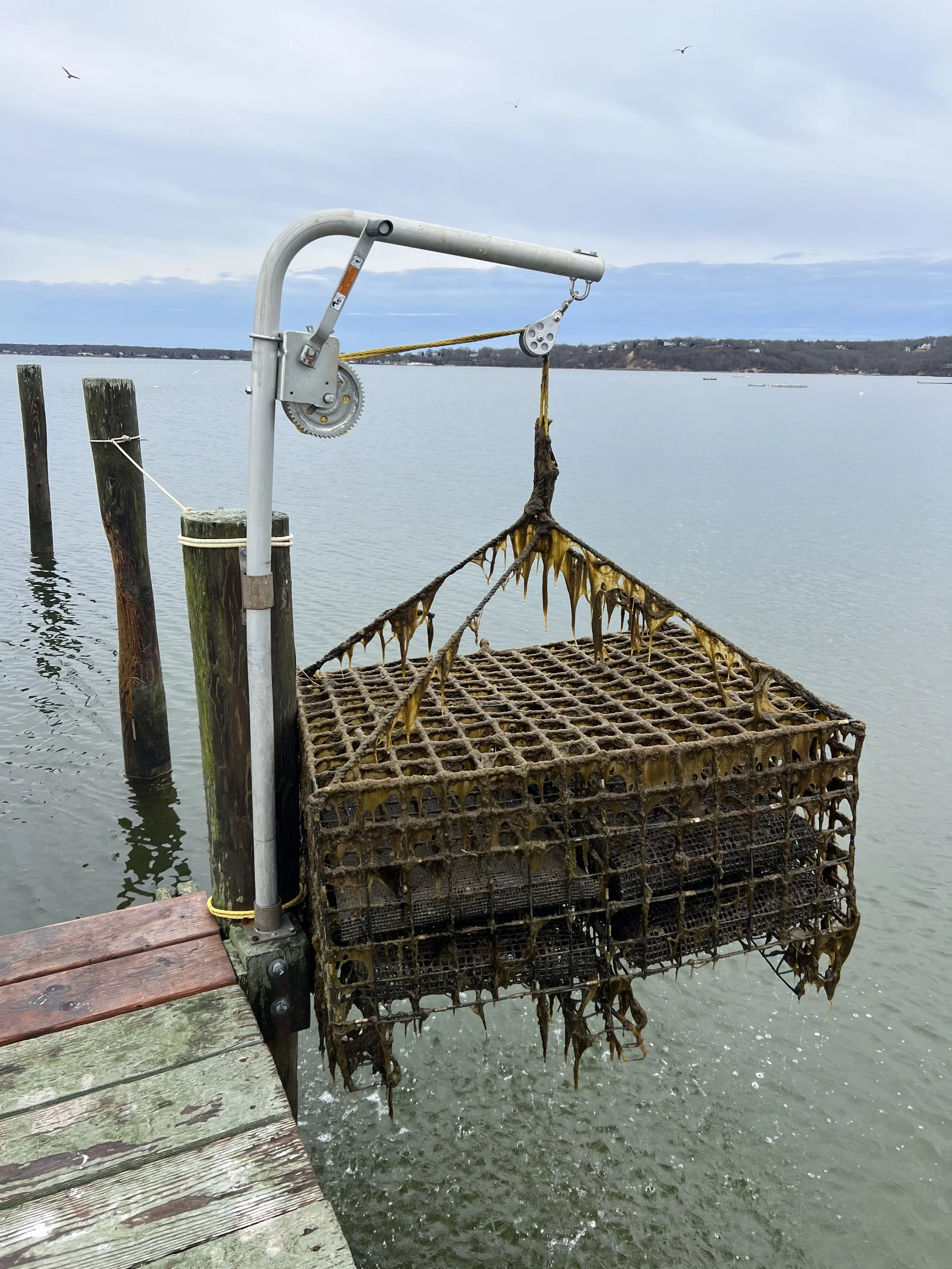 Oyster growing and marine restoration project located off of a dock in Pipes Cove, Greenport, NY– Shinnecock/Cortchaug land and waters.
