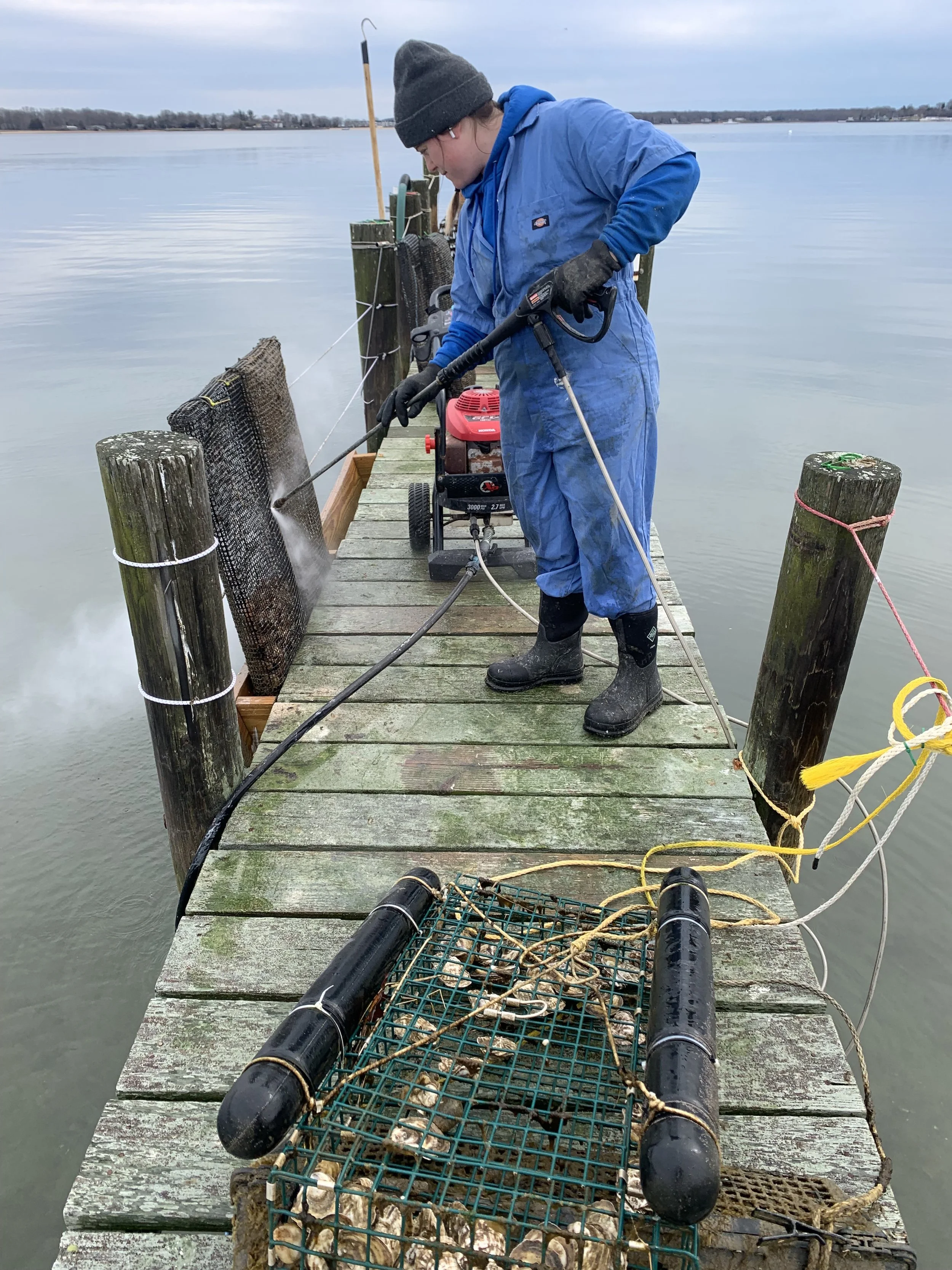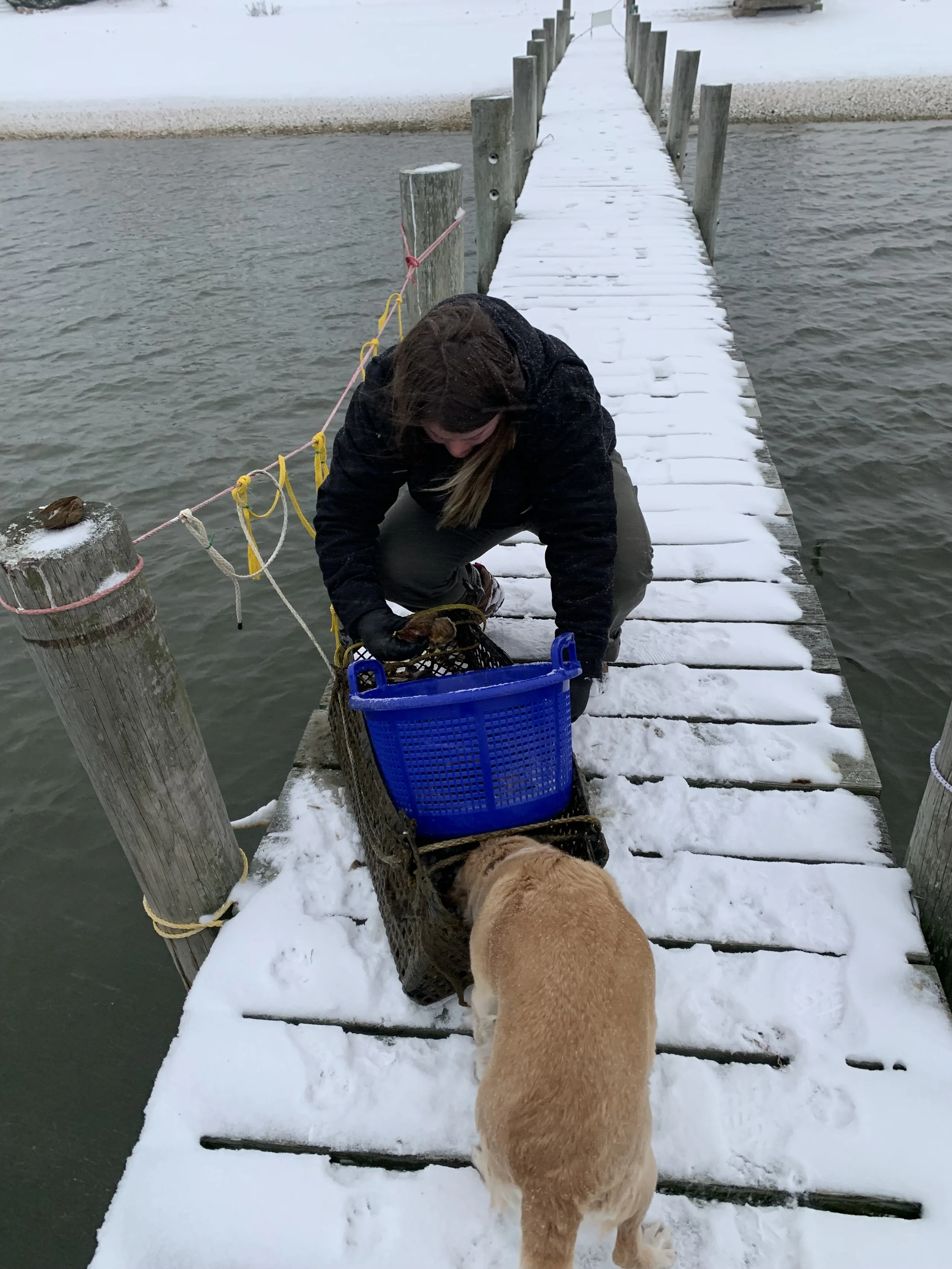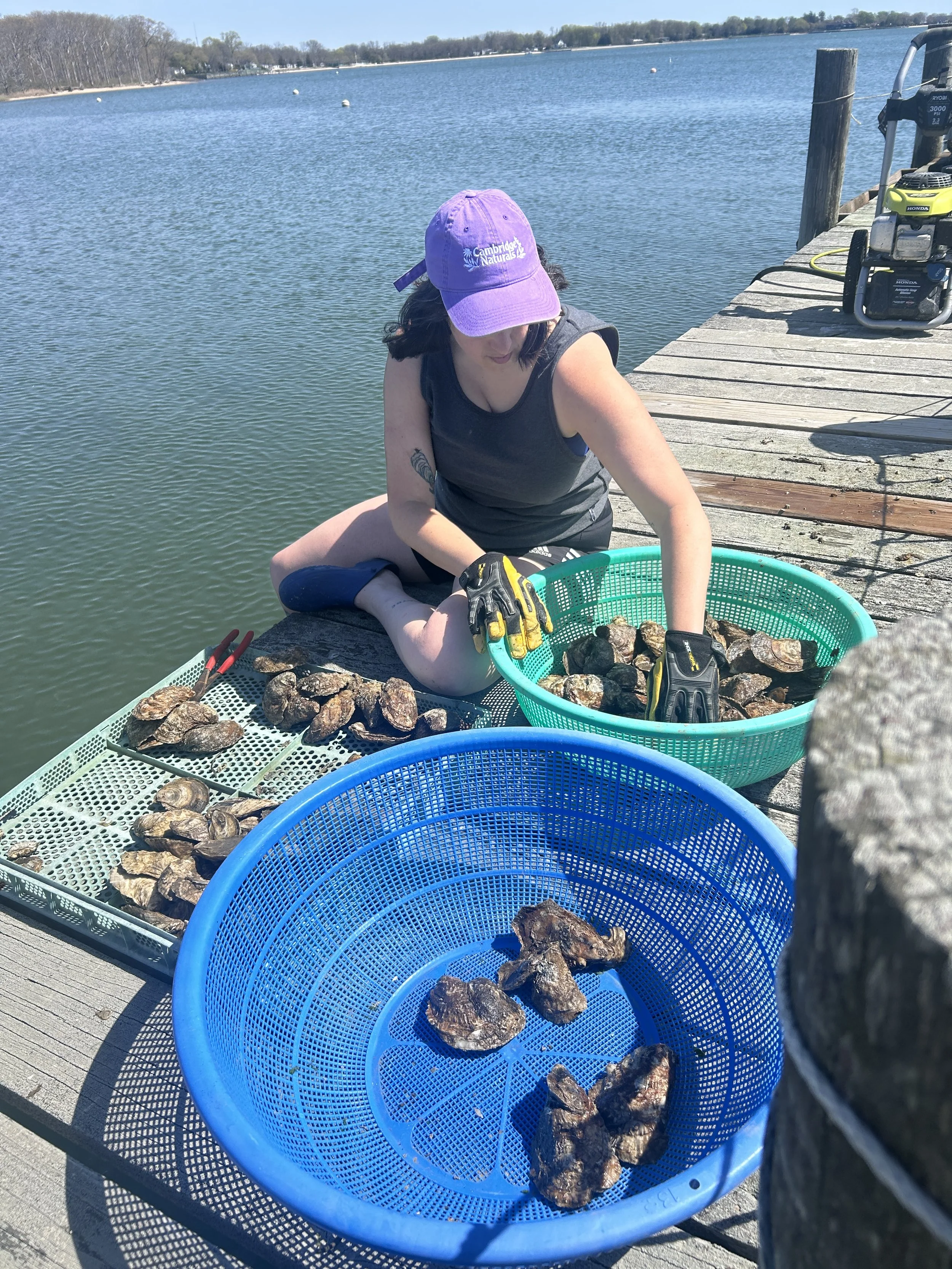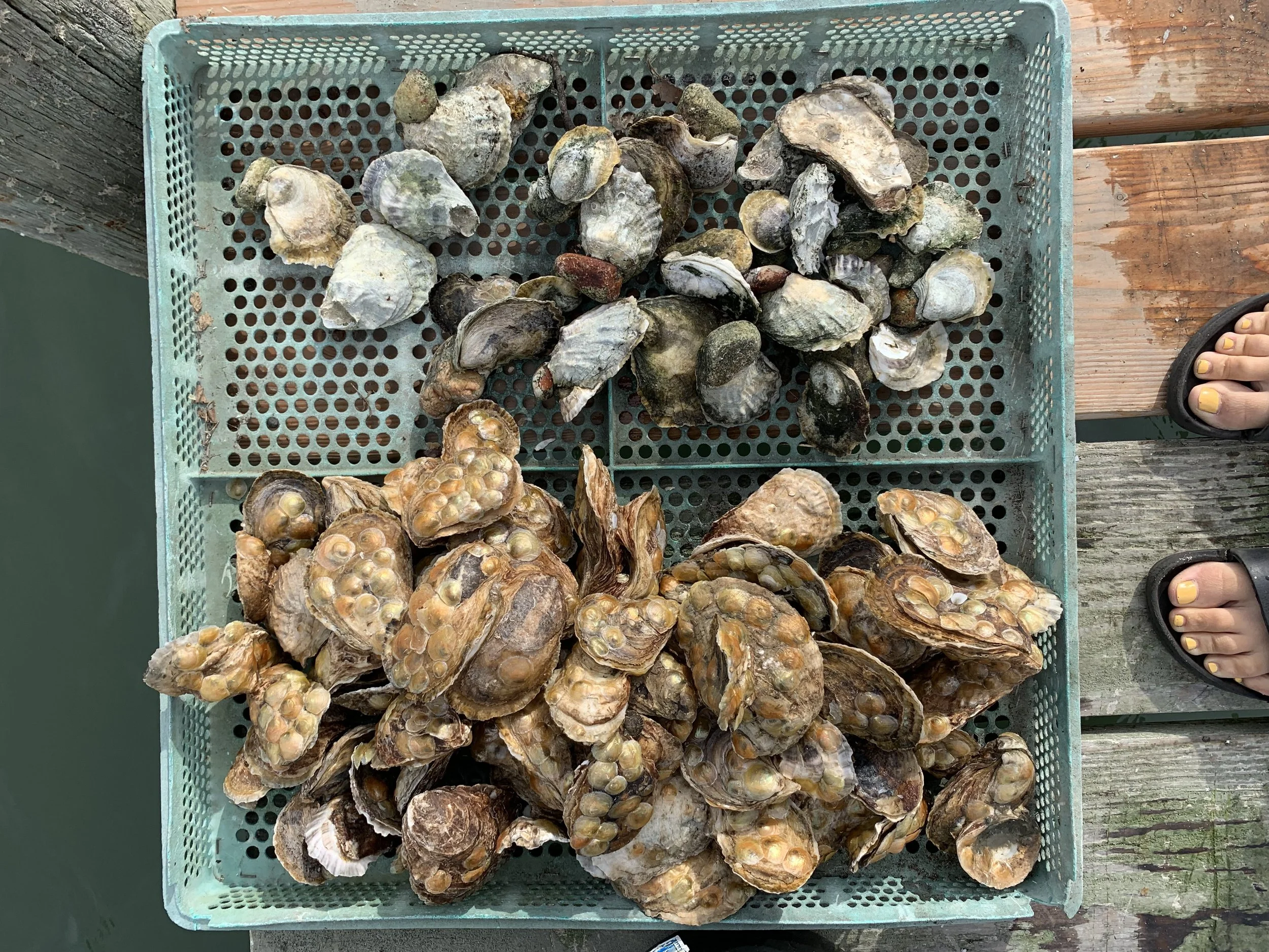 Oyster growing and marine restoration project located off of a dock in Pipes Cove, Greenport, NY– Shinnecock/Cortchaug land and waters.