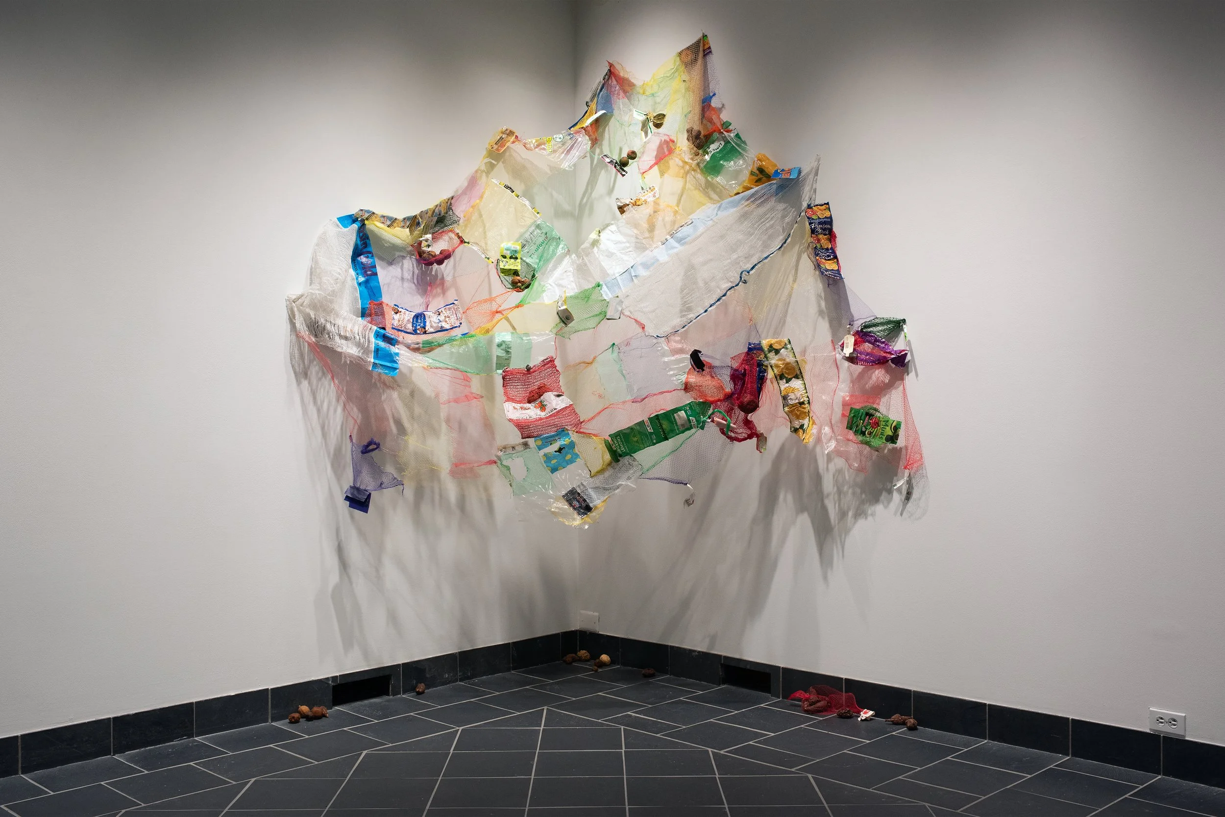 “… to fault a net for having holes” is made up of mended and melted produce nets saved up by the artist over years. The plastic meshes form an unstable matrix, recalling the Pacific Garbage Patch, used fishing nets, topography. Fruits in a state of desiccation and rot hang suspended or fall through gaps in the web. Consumption, disposability, broken supply chains, patchy support networks, obsolescent bodies— are themes of the work, which takes its title from the writer Maggie Nelson, and pays homage to Zoe Leonard’s Strange Fruit.